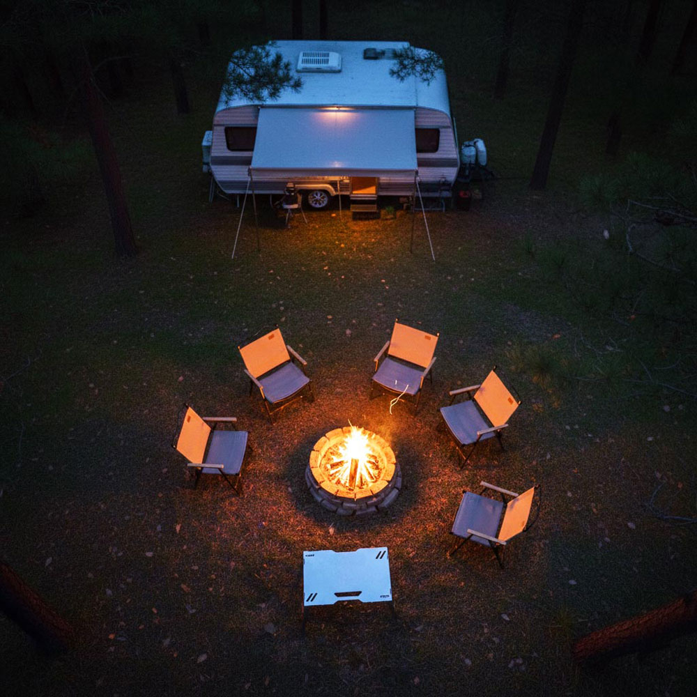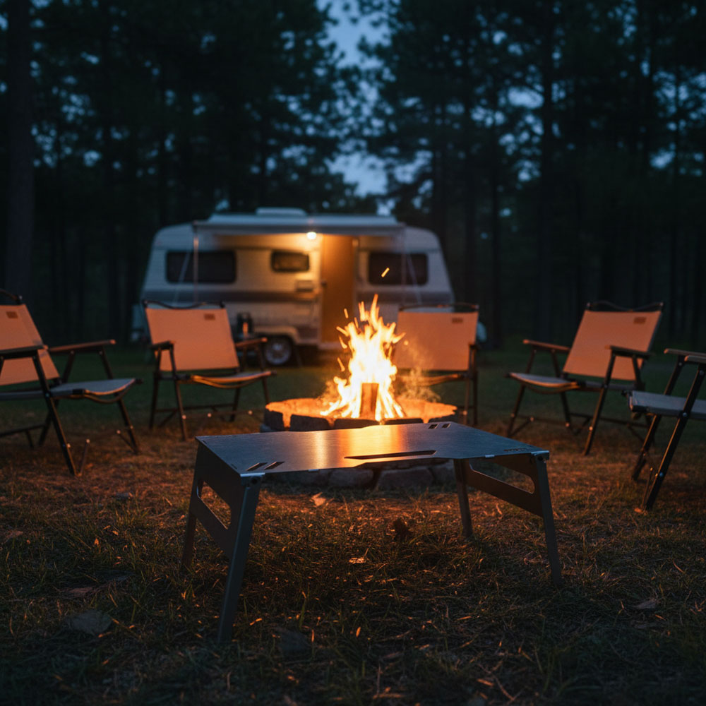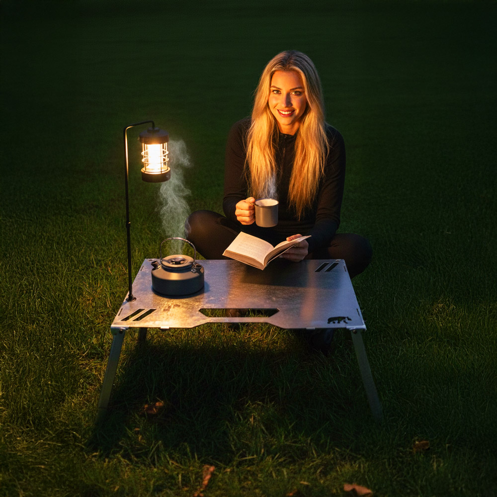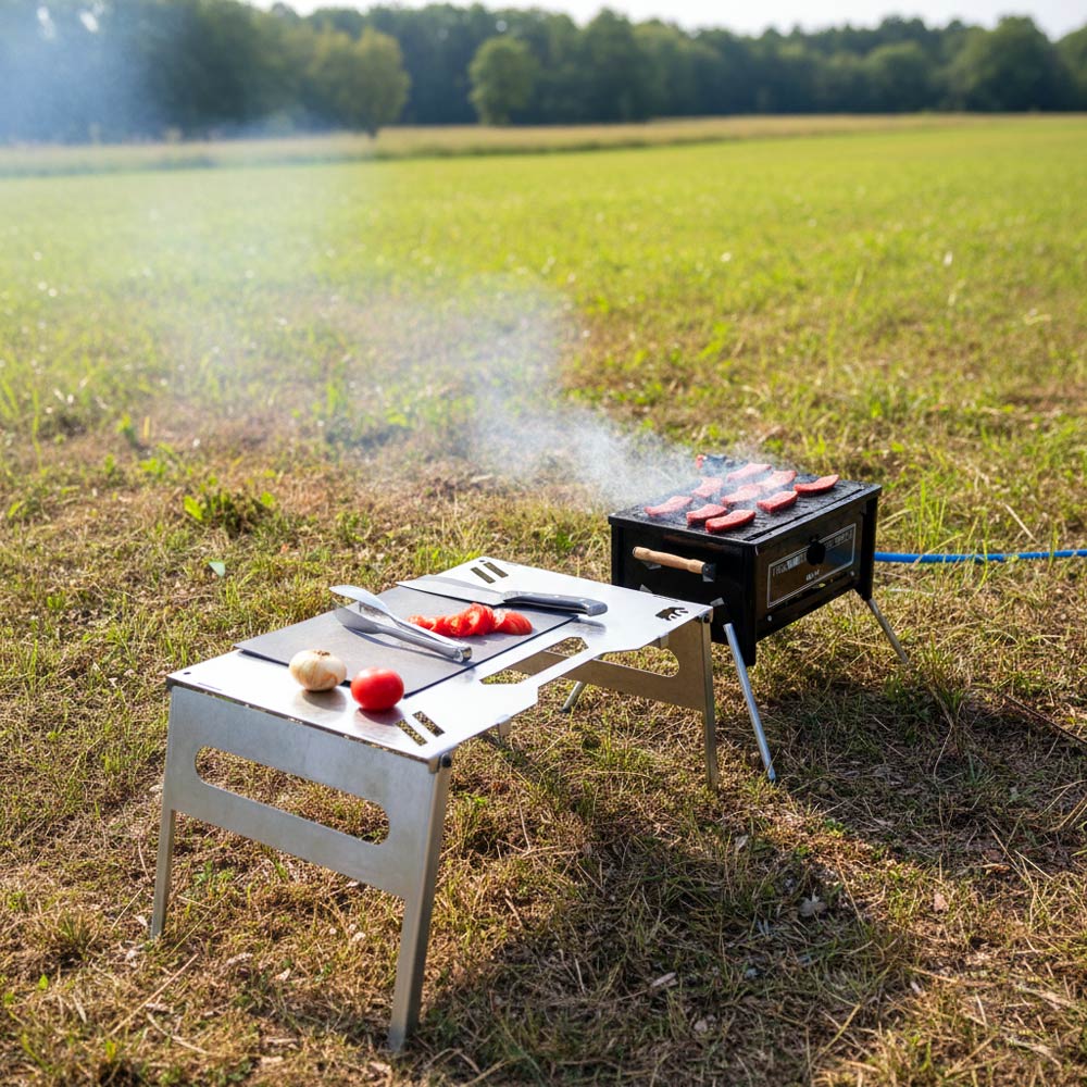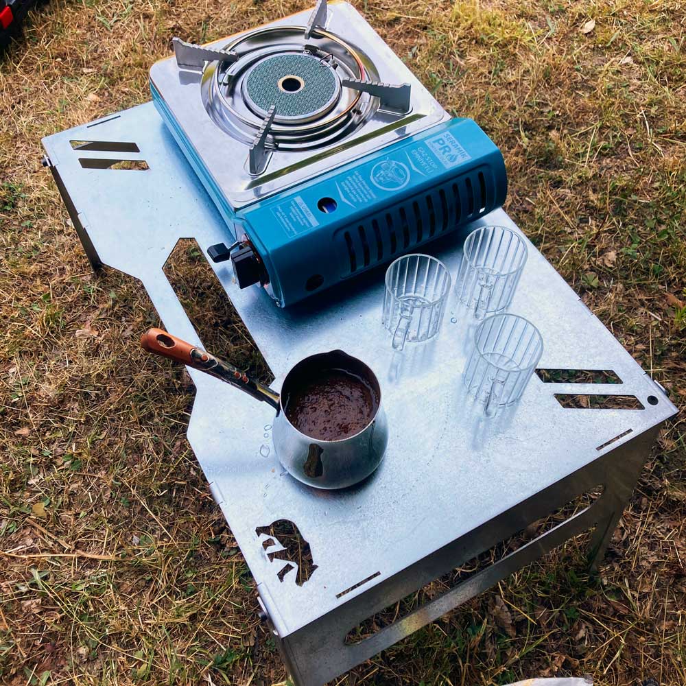 Ateş üstü ya da ızgara amacı taşımaz; doğrudan düz masa olarak tasarlanmıştır. Kamp alanlarında, karavan önlerinde, bahçede veya outdoor çalışma alanlarında sağlam ve dengeli bir yüzey sunar.